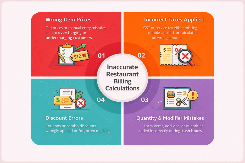 - Incorrect pricing – Charging the wrong amount for menu items